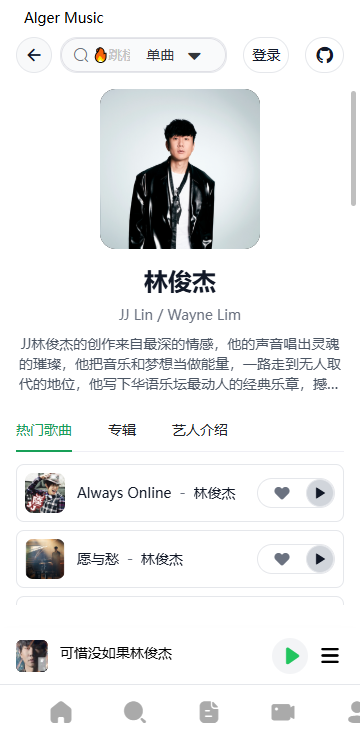AlgerMusicPlayer最新版 是一款开源、免费、无广告的网易云音乐第三方音乐播放器,最大的特点是能登录你的网易云音乐账号,同步歌单和收藏,并解决原平台歌曲变灰(因版权无法播放)的问题支持桌面歌词、音乐下载、最高音质